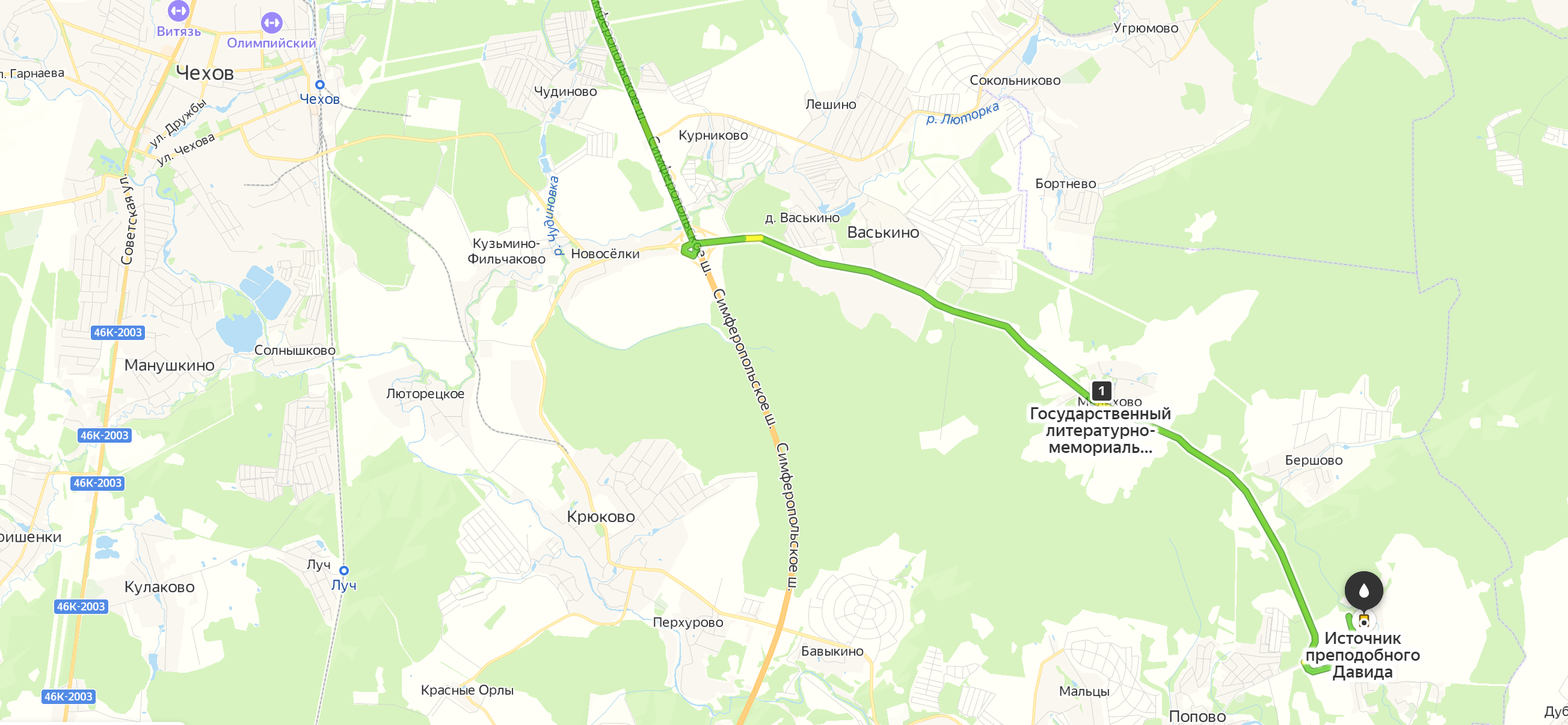 Усадьба расположена в 14 км от г. Чехов и 57 км от Москвы по Симферопольскому шоссе. Координаты: 55.113647, 37.647698